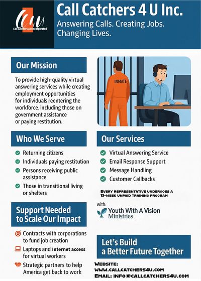 Our mission at Call Catchers 4 U Incorporated is to transform lives through meaningful employment opportunities, practical job training, and a supportive virtual workplace. We are committed to giving a second chance to individuals who have been overlooked — including those with felony records, youth aging out of foster care, people re-entering the workforce, and anyone in need of essential job skills — while providing excellent, reliable answering services to businesses around the world. By bridging the gap between purpose and opportunity, we strive to break cycles of poverty, reduce recidivism, and help eradicate hunger and homelessness, one call at a time.